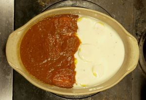 Œufs durs servis tièdes dans un duo de sauce tomate et de sauce blanche.